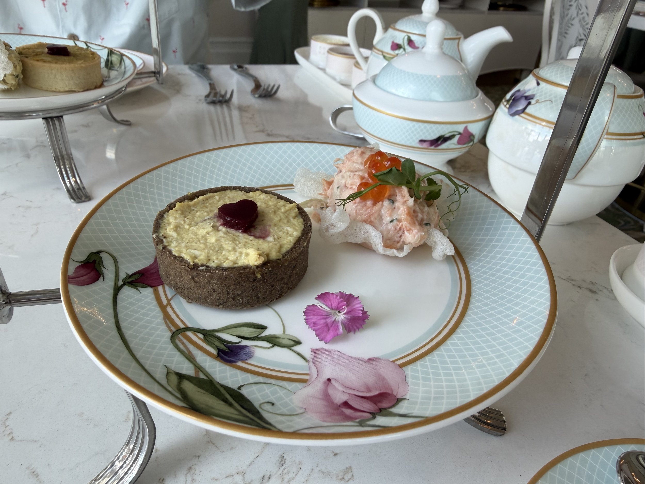 Since Brandon and I have different special dietary needs, we were each given our own small tea tray with safe food for each of us. While there was a bit of overlap in options, Brandon’s version was mostly a hybrid of the plant-based savory options and the regular menu.