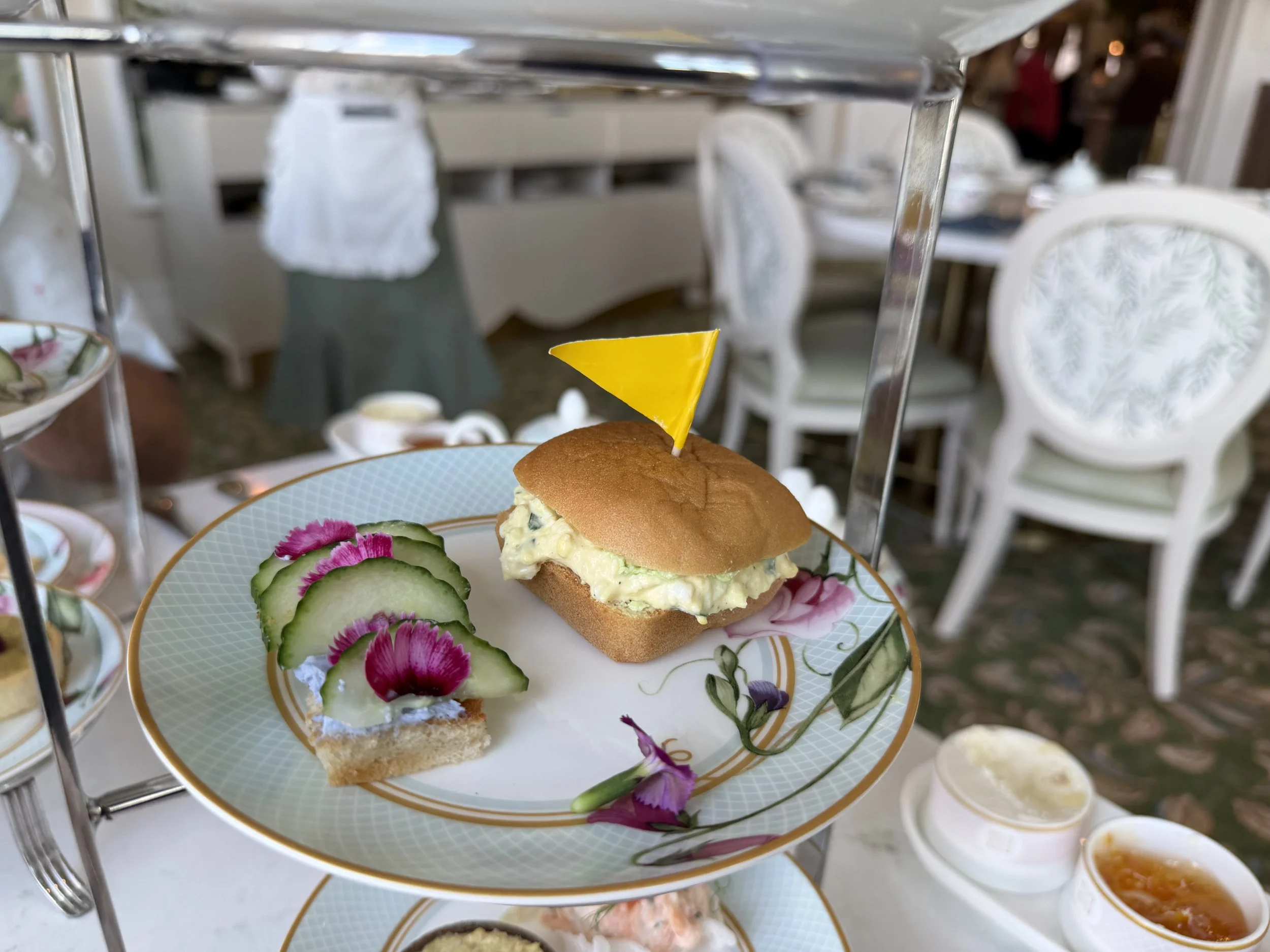 Next up were our afternoon tea trays filled with savory bites and sweet treats. The restaurant’s Alice in Wonderland inspiration really shines through on this presentation. The desserts are especially whimsical and fun.