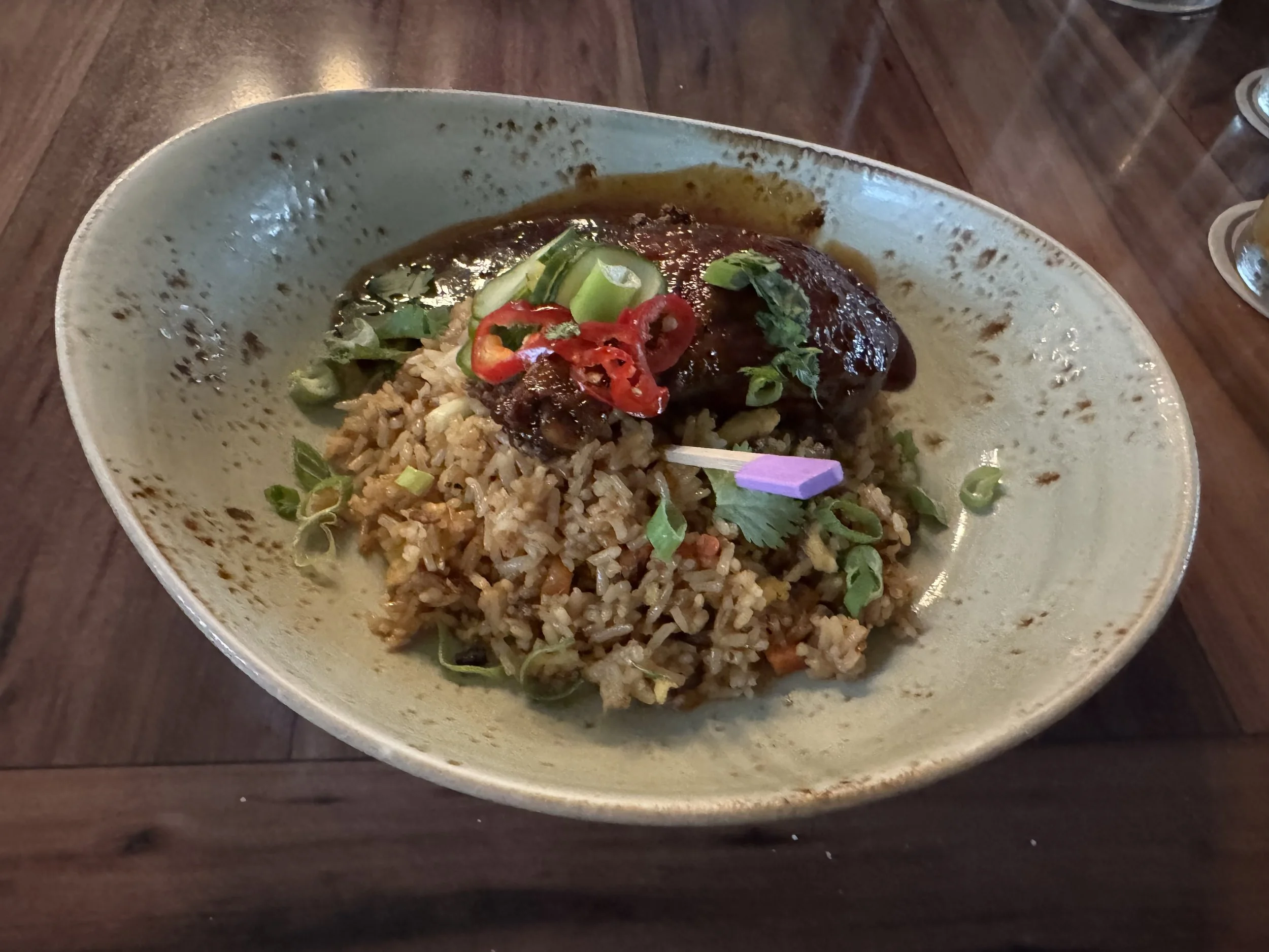 For my entree, I tried a new dish for me — Mess Hall Duck Fried Rice. This is marked GF and safe for Fish/Shellfish, Milk, Peanut/Tree Nut, Sesame Allergies.