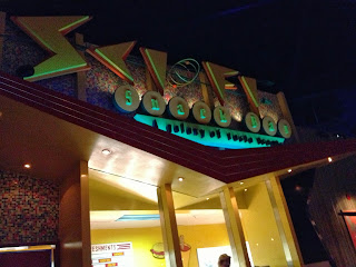 Sci-Fi Dine In at Disney's Hollywood Studios offers guests a chance to go back in time to 1950's drive-in theatres. Complete with tables that look like cars and screenings of old B film movies, you will definitely feel transported. The entire menu also fits the drive-in vibe and includes milkshakes, burgers, fries and all those things you'd expect from a typical drive-in. The great thing is that as a gluten free & dairy free diner, I have quite a few choices, including non-dairy milkshakes!On this particular visit, I went with my family before the DHS Villians Bash (which was crazy busy). Dining at Sci-Fi was a welcome retreat before the crowds. Before we waited to be seated, we took the time to look around that the interior design. I love the theming of this restaurant.